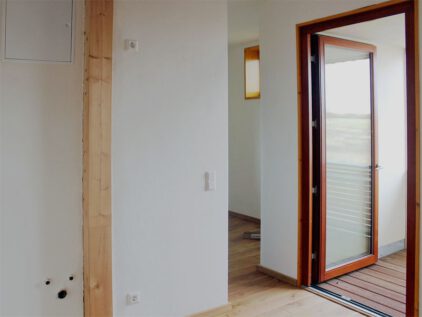 Über die Holztreppe erreicht man das Obergeschoss. Dort sind insgesamt 6 Räume, davon einer als Wohnküche und zwei mit kleinem Bad. Diese haben auch je einen Balkon mit 2,6 m².